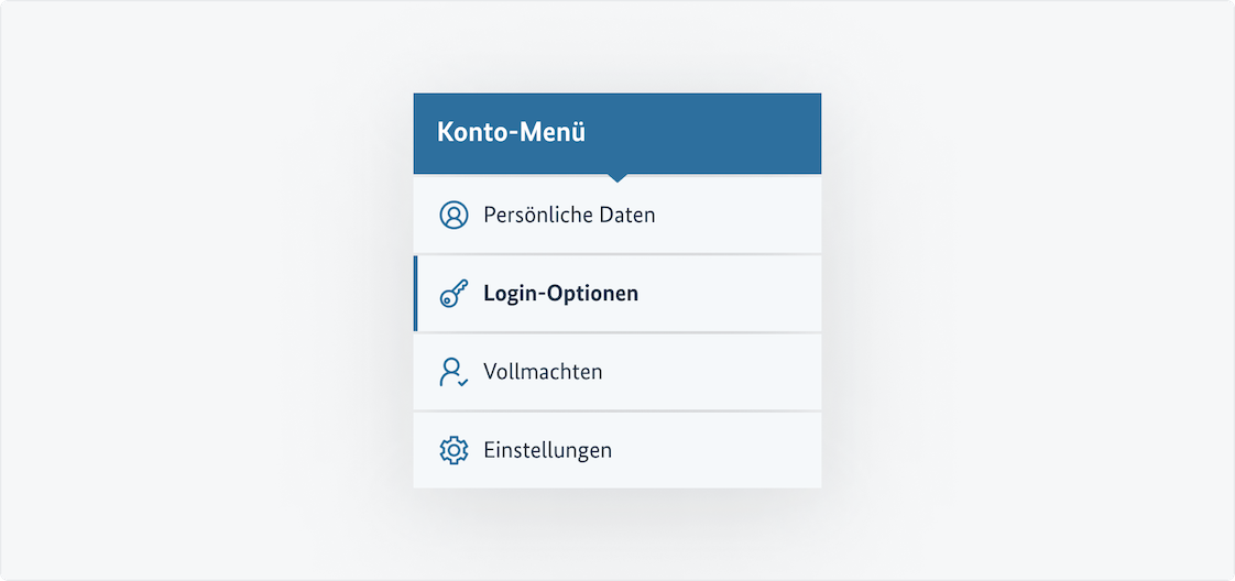 Die Seitennavigation enthält optional ein Icon links neben einem frei zu wählenden, sinnbildenden Text; beide vermitteln im Zusammenspiel die Funktion der Komponente. Wenn es sich bei der Seitennavigation um ein Collapsible handelt, dann ist das Chevron-Icon rechts die Aufforderung, ein geschlossenes Menü zu öffnen bzw. ein geöffnetes Menü zu schließen. Im geöffneten Menü selbst sind Icons (Pfeile oder andere gestaltete Elemente) als Verdeutlichung der Funktion der einzelnen Menüpunkte optional.