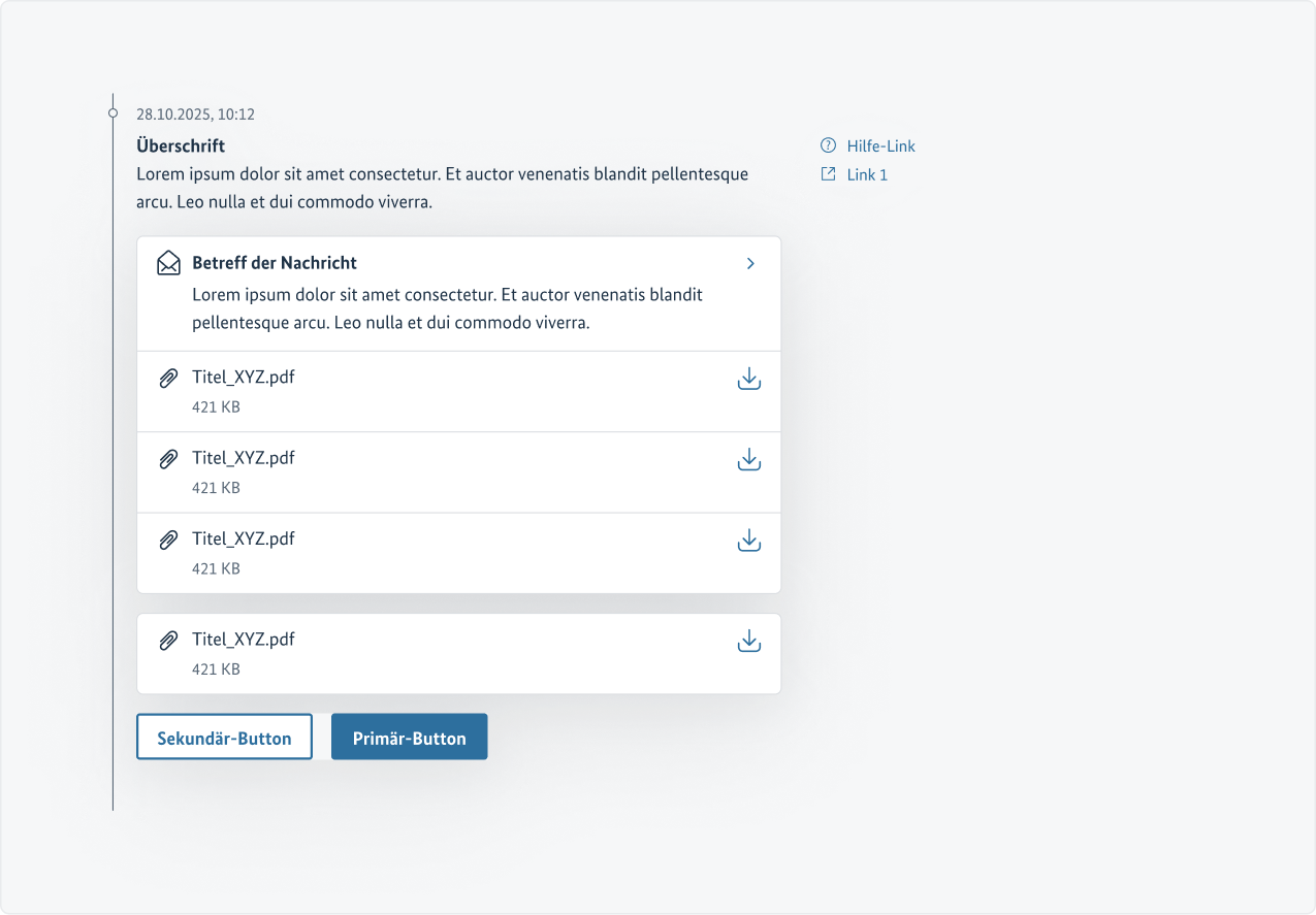 - Die Sektionen können z. B. gestalterisch eigenständige Container mit Überschrift, eine Nachrichtenvorschau in Textform, einen oder mehrere Download-Links, Iconbuttons, Dateianhänge, Hyperlinks und Button-Links, Statusanzeigen (gelesen/ungelesen) sowie Primär- und Sekundär-Buttons enthalten; alle weiteren Inhalte und deren Aufbau sind optional.