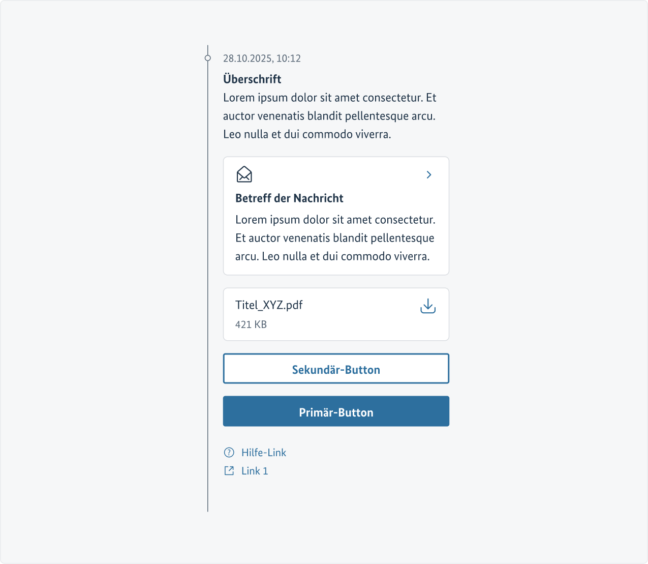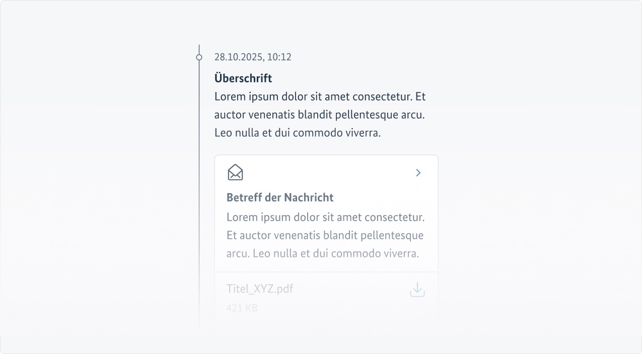 - Die Timeline enthält grundsätzlich keine komplexen Inhalte wie Tabellen, Formulare mit Eingabe- und Auswahlfeldern oder Muster wie Paginierungen, Akkordeons oder Tab-Interfaces.