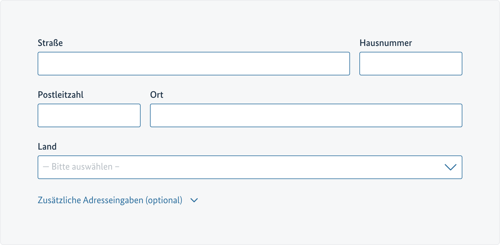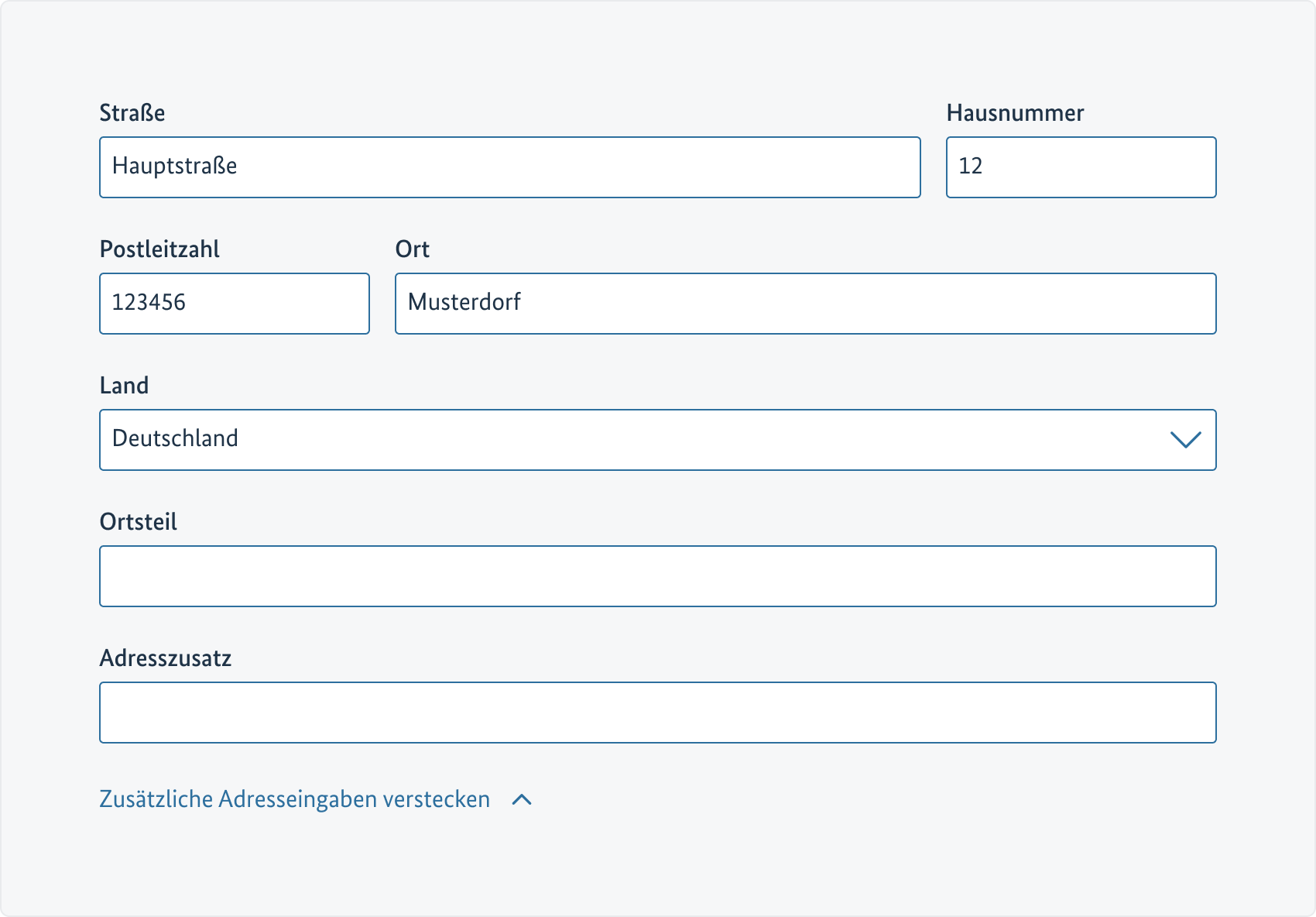 Optionale Felder wie Adresszusätze, Ortsteile etc. können in einem initial geschlossenen Akkordeon dargestellt werden.