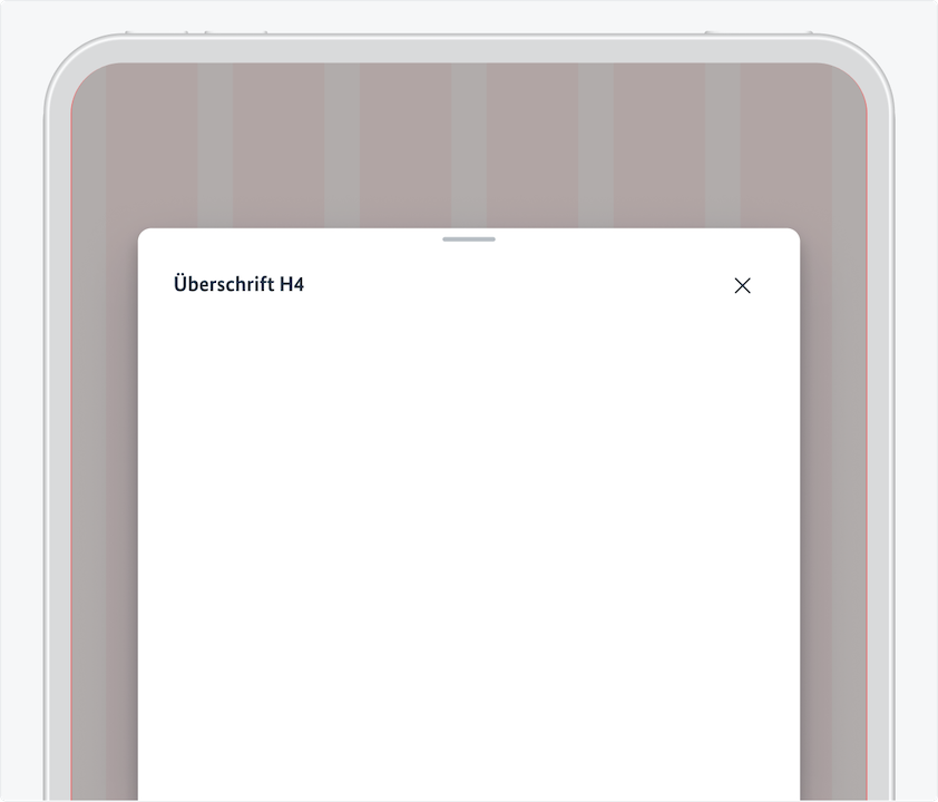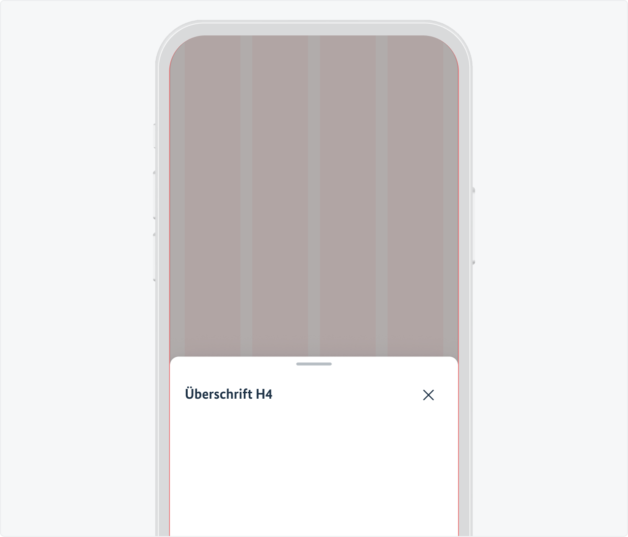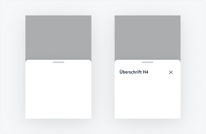 Um einen schnellen Zugriff auf die obersten Aktionen zu ermöglichen, ist die anfängliche vertikale Position der modalen Bottom Sheets auf calc(100% - 3rem) der Bildschirmhöhe begrenzt. Wenn der Inhalt calc(100% - 3rem) der Bildschirmhöhe überschreitet, dann können Sheets auf die gesamte Bildschirmhöhe aufgezogen und auch innerhalb gescrollt werden, um auf die überfließenden Inhalte zuzugreifen.