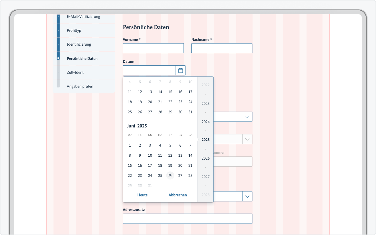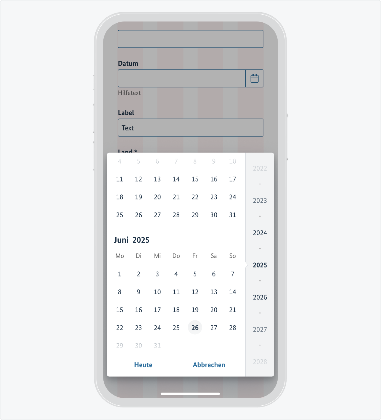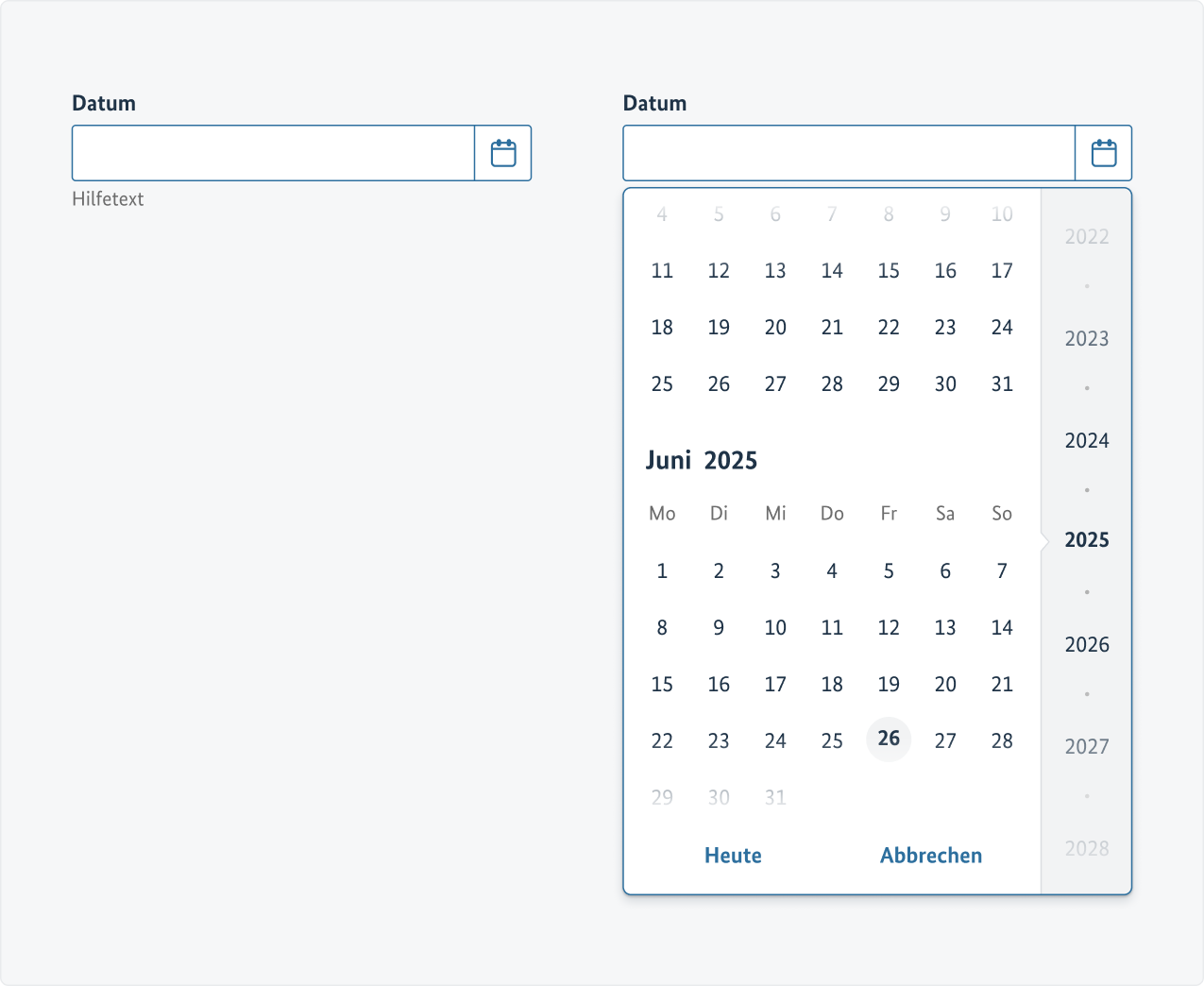 Datepicker dienen der unmittelbaren Eingabe von Datumsangaben oder der mittelbaren Auswahl aus einer kalendarischen Ansicht. Als sekundäres Komfortmerkmal kann zusätzlich ein optionales Datepicker-Widget eingebunden werden, allerdings immer nur als Fallback zu den ebenfalls angebotenen Eingabefeldern.