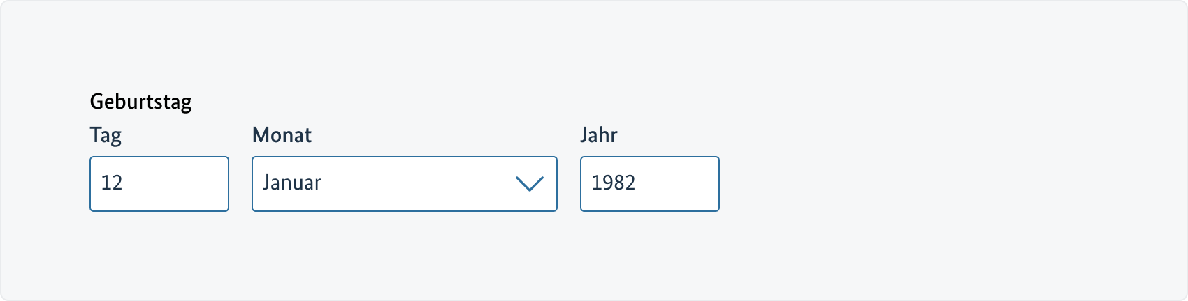 Fieldset und Legend können optional verwendet werden, um inhaltlich zusammenhängende Formularelemente zu gruppieren, voneinander abzugrenzen und eindeutig zu beschriften. Bitte beachten Sie hierbei die Hinweise zu Texten in Legends im Tab Barrierefreiheit.