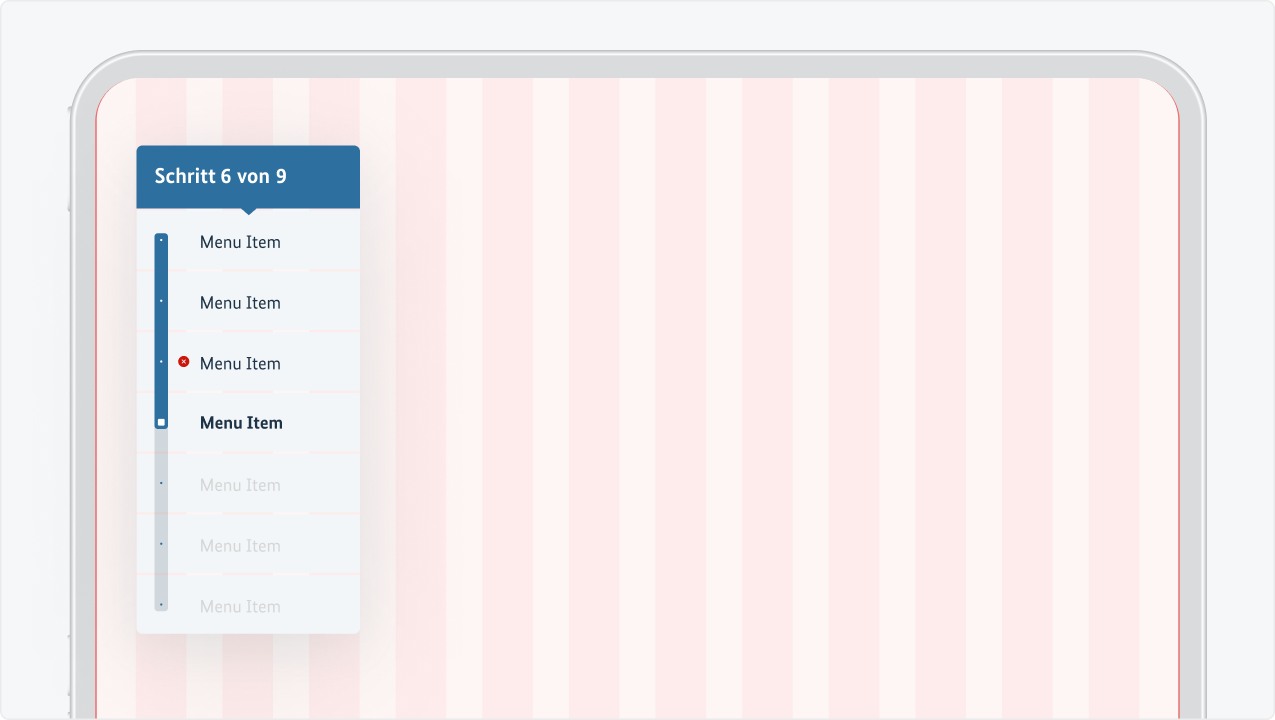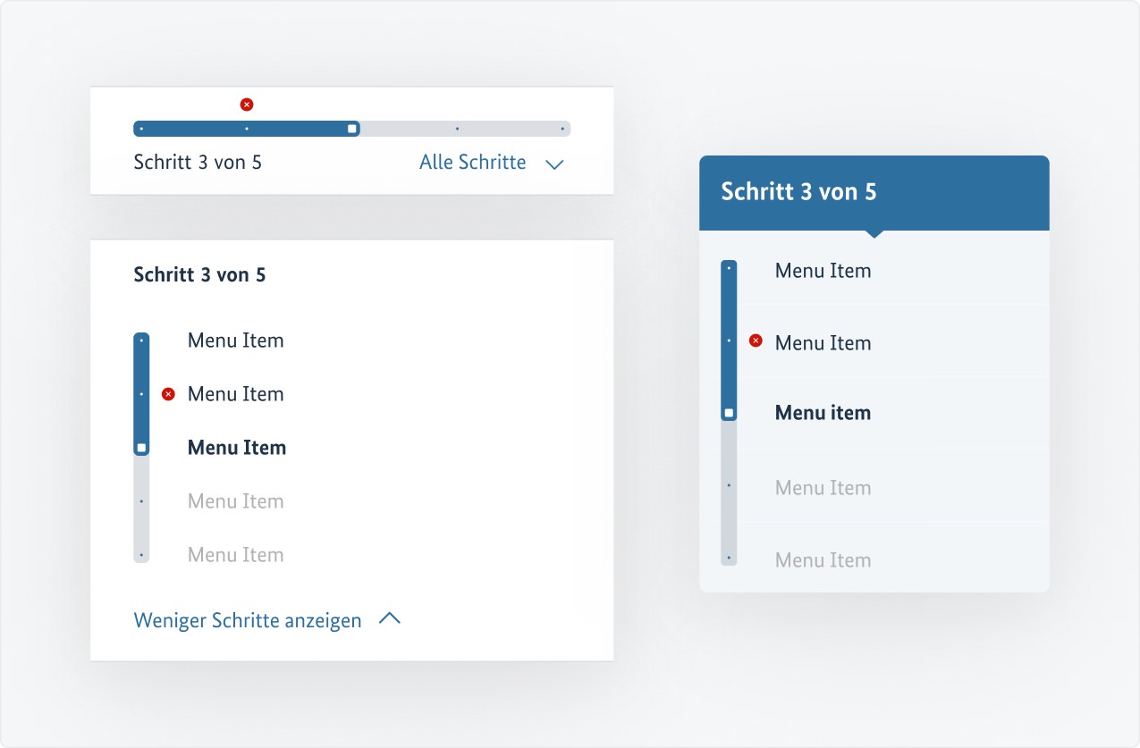 Die Fortschrittsnavigation dient zum einen der Darstellung der Schritte eines laufenden Prozesses. Sie zeigt an, bei welchem Schritt sich Nutzende gerade befinden, die Gesamtzahl der Schritte und den Gesamtfortschritt in mehrstufigen Prozessen.