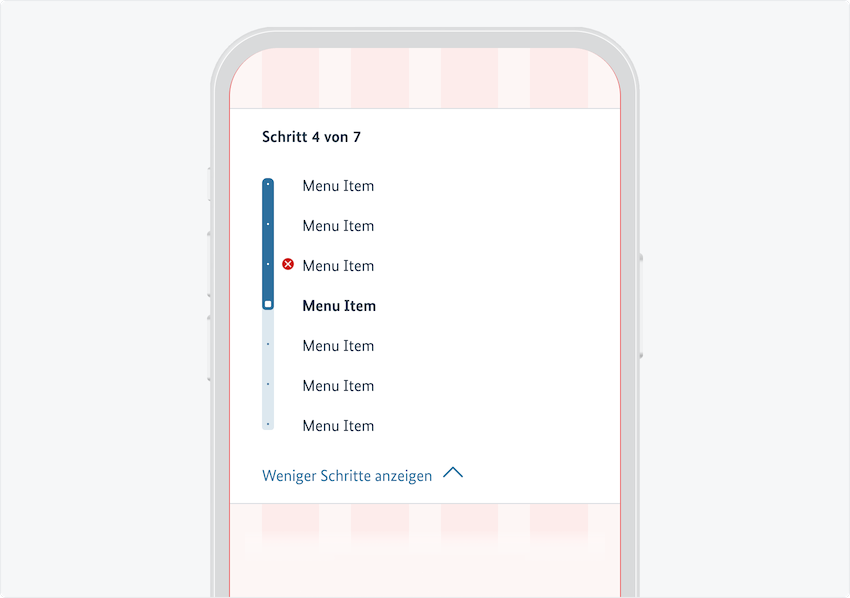 - Ein Schritt kann fehlerhaft sein, wenn ungültige oder unvollständige Informationen eingegeben wurden. Neben der Hervorhebung als Fehler kann hier optional bereits ein Hinweis auf die Art des Fehlers gegeben werden, z. B. über ein entsprechendes Tooltip auf dem Symbol.