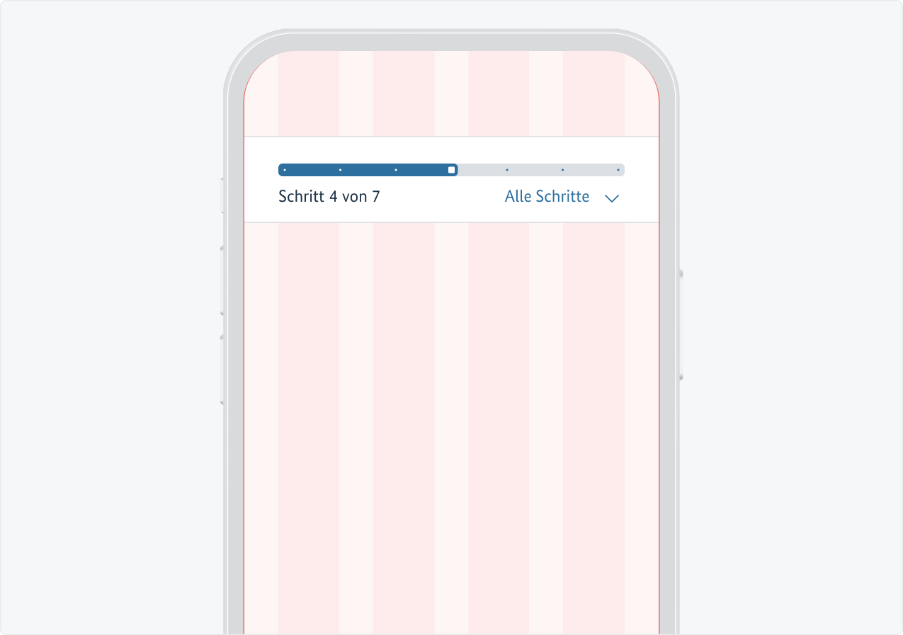 - Die Fortschrittsnavigation nimmt die volle Breite des Viewports ein. Das Padding innerhalb der Komponente muss mit dem Seitenabstand übereinstimmen, dass die Inhalte der Komponente im Grid liegen.