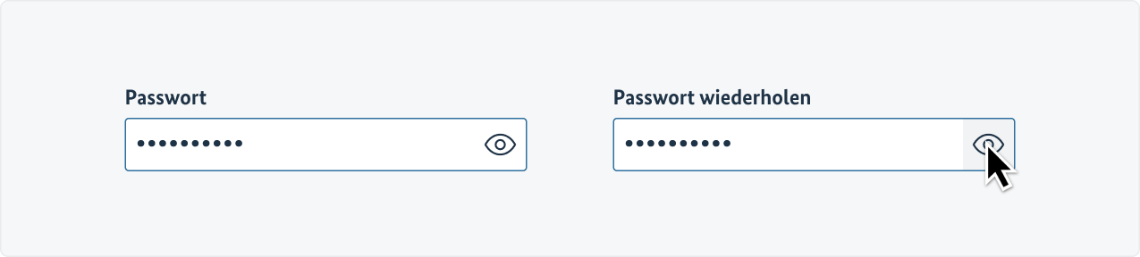 Als Komfortmerkmal enthalten Passwort-Felder einen zusätzlichen Button, mit dem das initial per ••• maskierte Passwort im Klartext angezeigt werden kann; dies erleichtert die Überprüfung der Einhaltung von Passwortregeln. Obwohl es sich technisch um ein seperates Element handelt wird dieser Button optisch als integraler Bestandteil des Passwort-Felds dargestellt. Die Vorgaben zur Einbindung dieses Buttons finden sie als allgemeiner gehaltenes Muster bei input type="text".