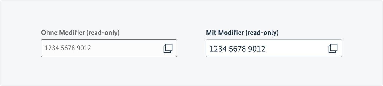 Rein darstellende Elemente mit readonly-Attribut sind bereits serverseitig mit Daten befüllt, die nicht mehr editierbar sind, und erhalten eine eigenständige Gestaltung, die ihren Zweck visualisiert. Optional können readonly-Felder zugeordnete weitere Inhalte haben, mit denen die Herkunft der vorbefüllten Daten vermittelt wird, z. B. durch ein ELSTER-Logo.
