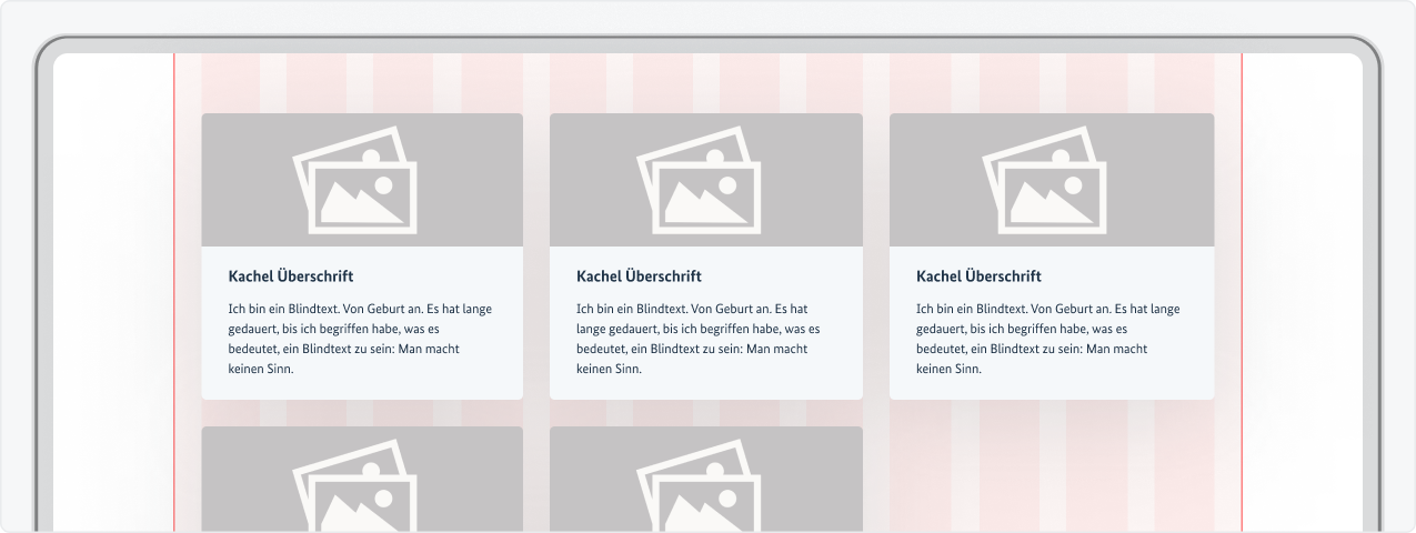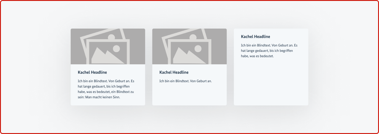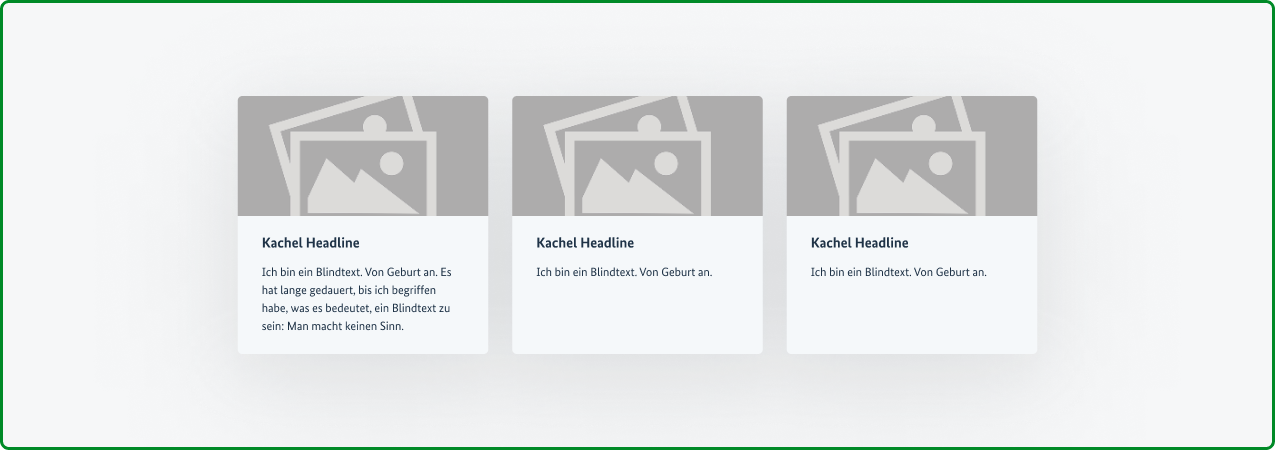 Die Kacheln sollten immer in einem für sie spezifischen Grid verwendet werden, um auf verschiedenen Bildschirmbreiten die gewünschte Anzahl an Kacheln in einer Reihe zu erhalten. Zudem sorgt ein spezifischer Grid-Kontext für die richtige Dimensionierung der Kacheln. Das erste Beispiel zeigt eine mögliche Einbindung in ein Grid. Die weiteren Beispiele sind mögliche Kachel-Ausprägungen ohne Grid-Kontext.