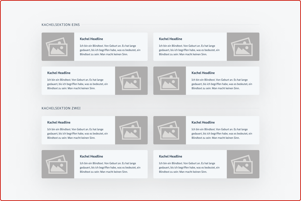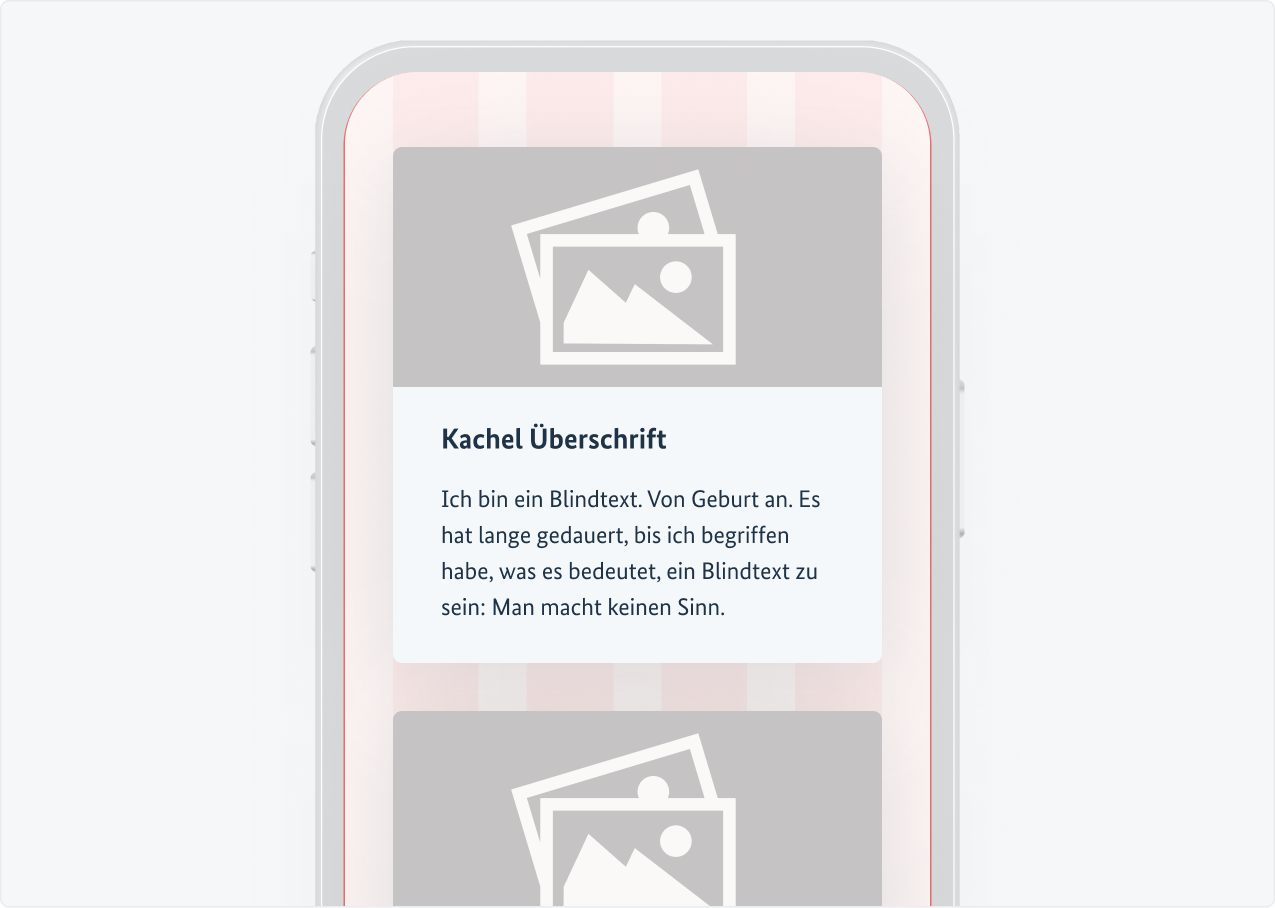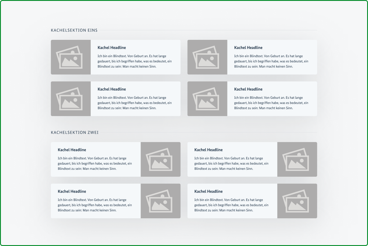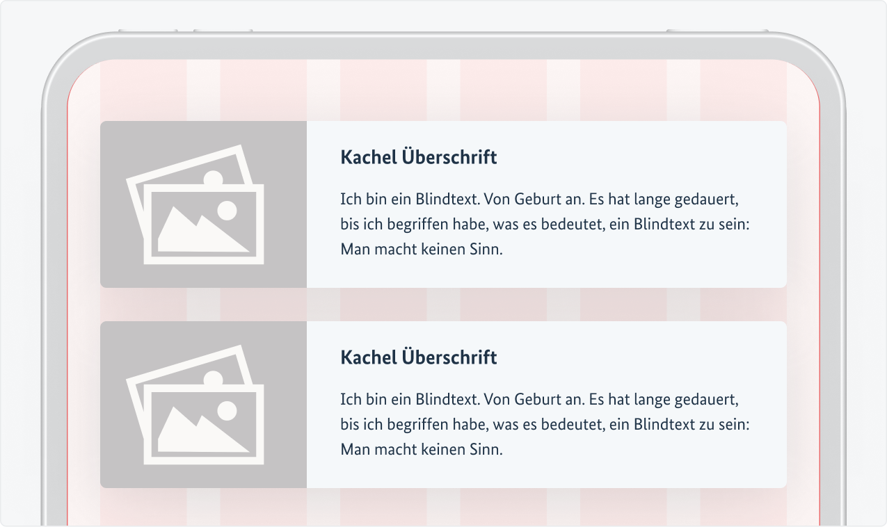 Kacheln mit Bild – die Kachel enthält ein Bild, eine, auf die ganze Kachel ausgedehnte, verlinkte Überschrift und einen Text.