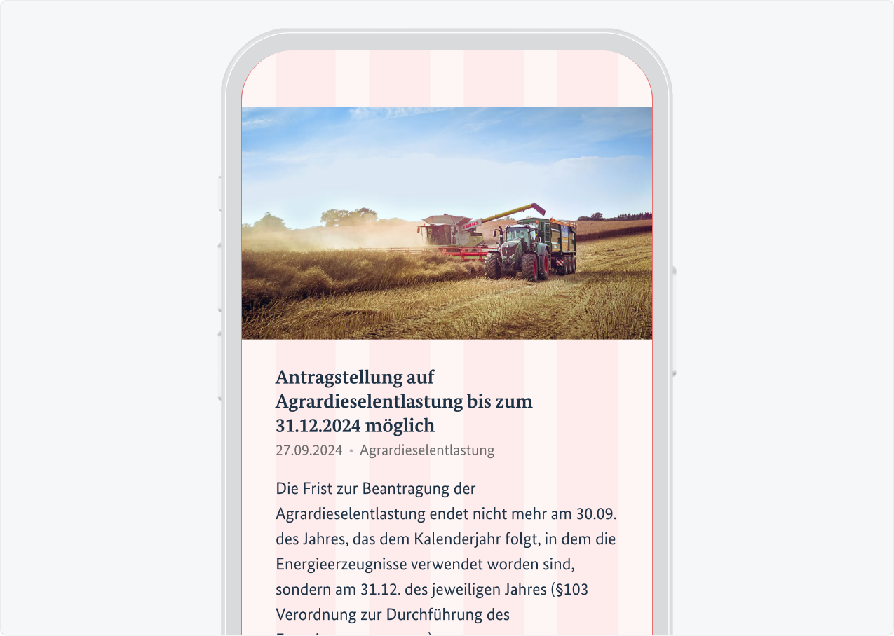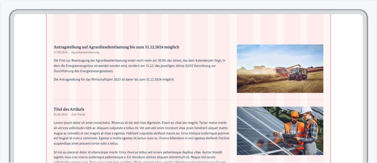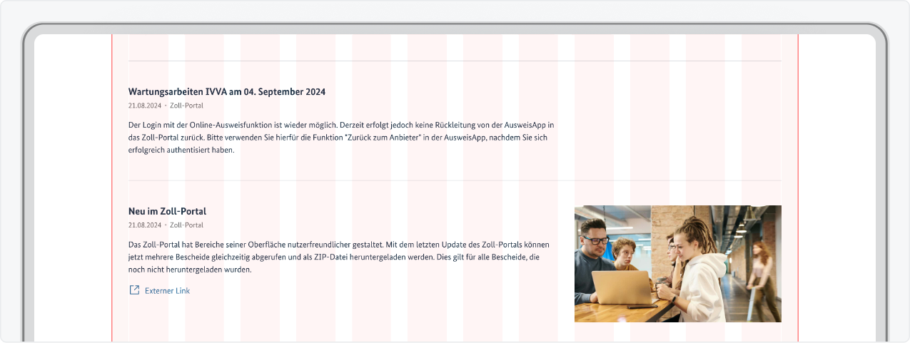 Auf dieser Seite befindet sich die Komponente in einem Container innerhalb des Grids des Seitenlayouts. Dies verhindert die Darstellung des Bildes auf voller Device-Breite für Breakpoints von Medium abwärts. Die originäre Darstellung der Komponente wurde auf der Beispielseite „Aktuelle Meldungen“ umgesetzt.