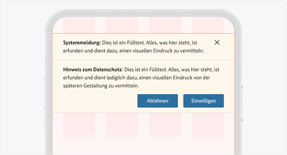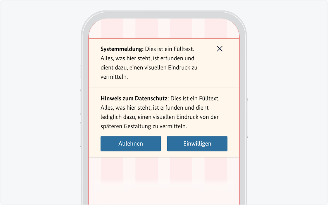 Diese Form der Systemmeldung kann auch für Cookie-Hinweise verwendet werden. In diesem Fall sind weitere Schaltflächen zum Akzeptieren bzw. Ablehnen von Cookies erlaubt. In allen anderen Fällen, die über den Text hinausgehende Formularelemente für Eingaben oder Auswahlen benötigen, muss statt einer Systemmeldung ein Modaler Dialog verwendet werden.
