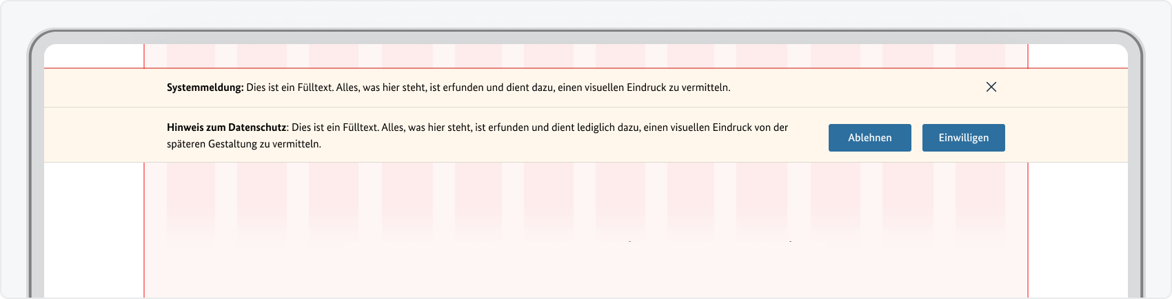 Übergreifende Systemmeldungen werden anders als Modale Dialoge nicht in Form eines Overlays angezeigt, das die jeweiligen Masken überdeckt, sondern sie schaffen sich ihren eigenen Bereich, indem sie oberhalb des Headers angezeigt werden. Sie finden Verwendung für allgemeine Hinweise zur Anwendung wie z. B. Hinweise auf kommende Wartungsfenster, an denen die Anwendung nicht zur Verfügung steht. Die Inhalte sind je nach Situation frei bestimmbar, sollten aber ein Maß von ca. 4 Textzeilen nicht überschreiten.