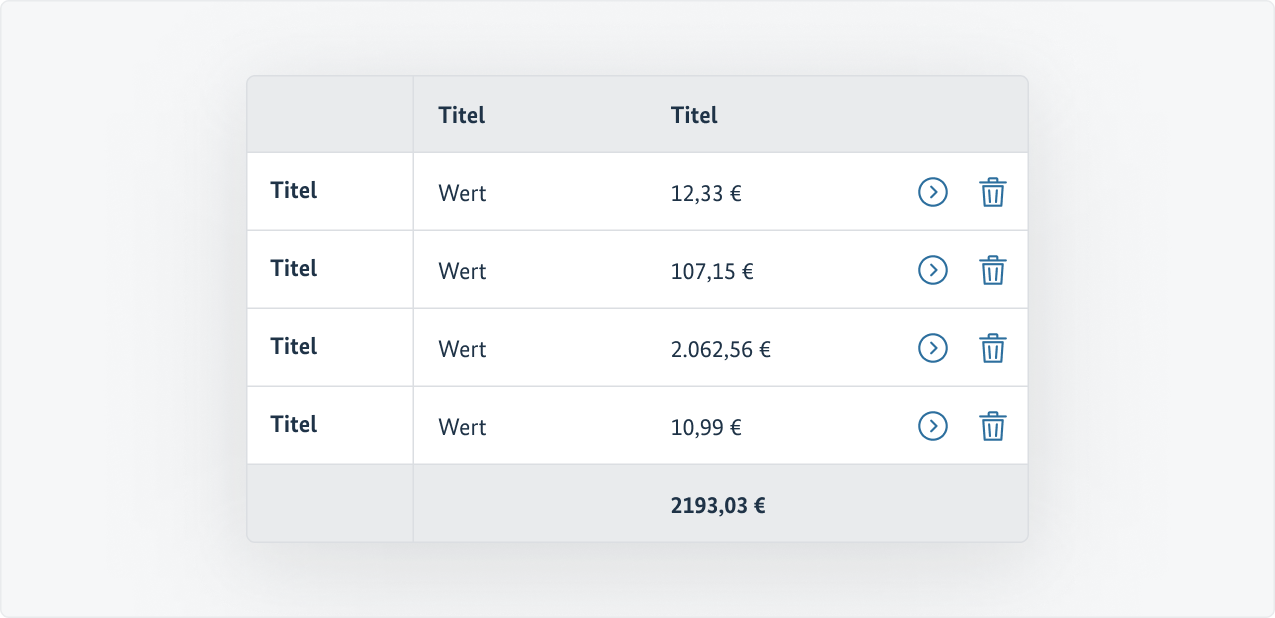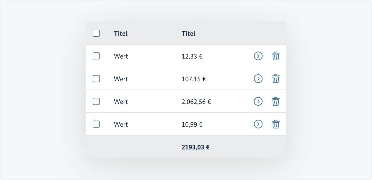 Texte in Datenzellen sollen, wie auch in Fließtexten, grundsätzlich linksbündig ausgerichtet sein, Zahlen hingegen oftmals rechtsbündig, und Icon-Buttons in Funktionsspalten zentriert sein. Bei der Darstellung von numerischen Daten mit Dezimalstellen muss darauf geachtet werden, dass alle Zellen die gleiche Anzahl Dezimalstellen enthalten (12,99 € und 9,00 € statt 9 €). Das Design System stellt hierfür entsprechende Klassen zur Verfügung.