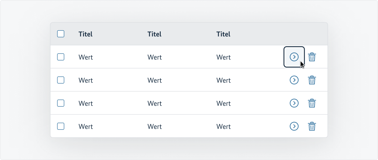 Innerhalb der Datenzellen einer Tabelle können weitere Text- und Formularelemente verwendet werden, wie z. B. Ausgabetexte, Checkboxen oder Icon-Buttons. Standard-Buttons sind in Datentabellen (th und td) nicht vorgesehen, sondern müssen in einer separaten Schaltflächenzeile außerhalb der Tabelle platziert werden.