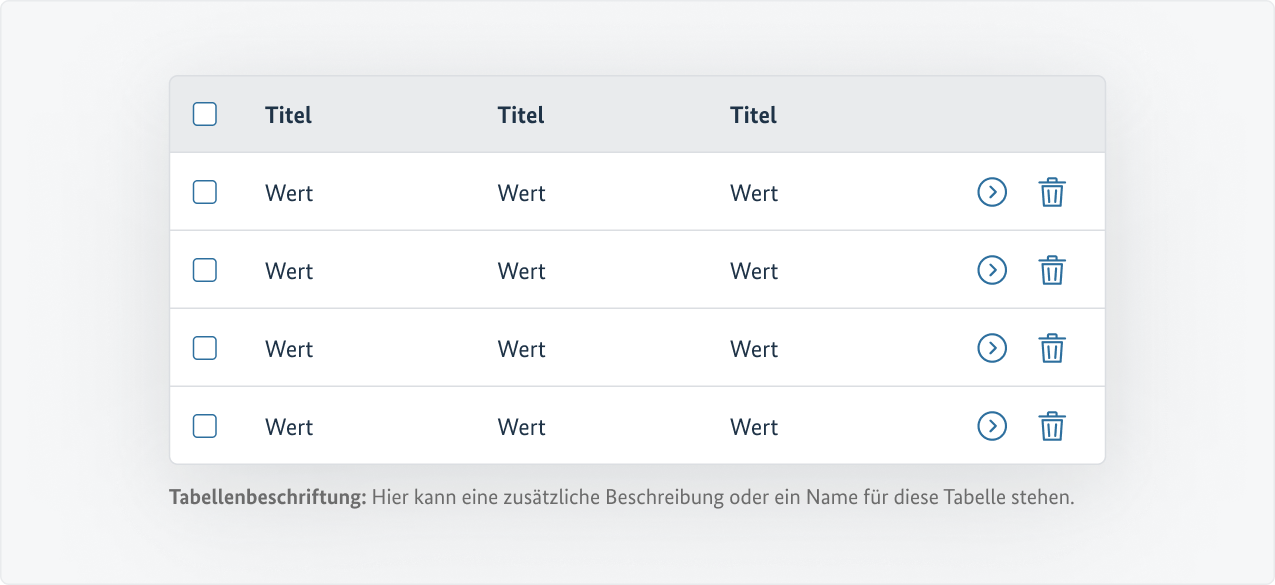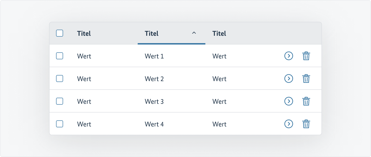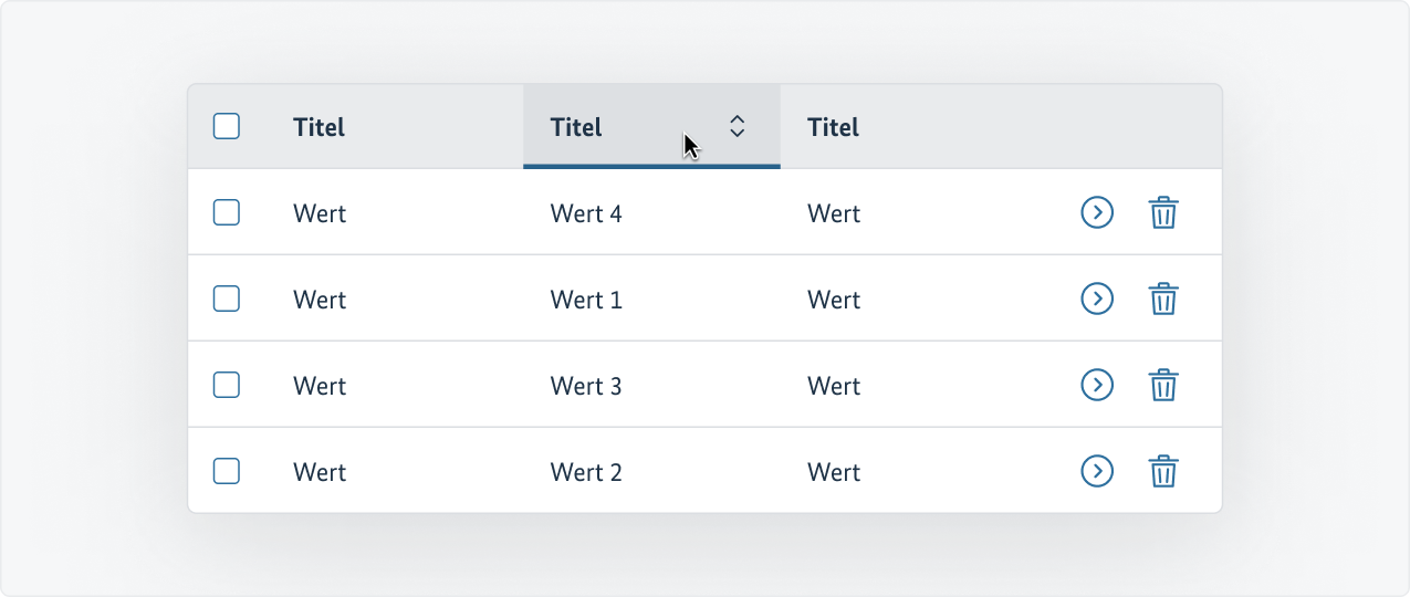 Jeder Tabelle ist eine Kopfzeile <thead> übergeordnet, in der die zugeordneten Spalten über die Spaltenköpfe <th> benannt werden und per scope="row" oder scope="col" verknüpft werden. Wenn sinnvoll können Zeilen einer Tabelle auch eine Zeilenüberschrift <th> erhalten – diese steht dann grundsätzlich links in einer Zeile und beschreibt deren Inhalte. <th>-Elemente enthalten ausschließlich Text, optionale Icon-Buttons zur Sortierung der Zeilen. Spalten- und Zeilenköpfe <th> dürfen keine Tooltips enthalten.