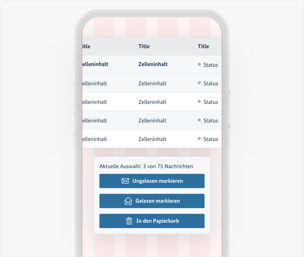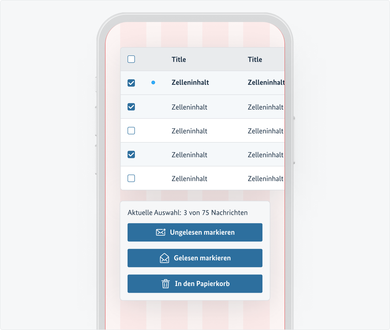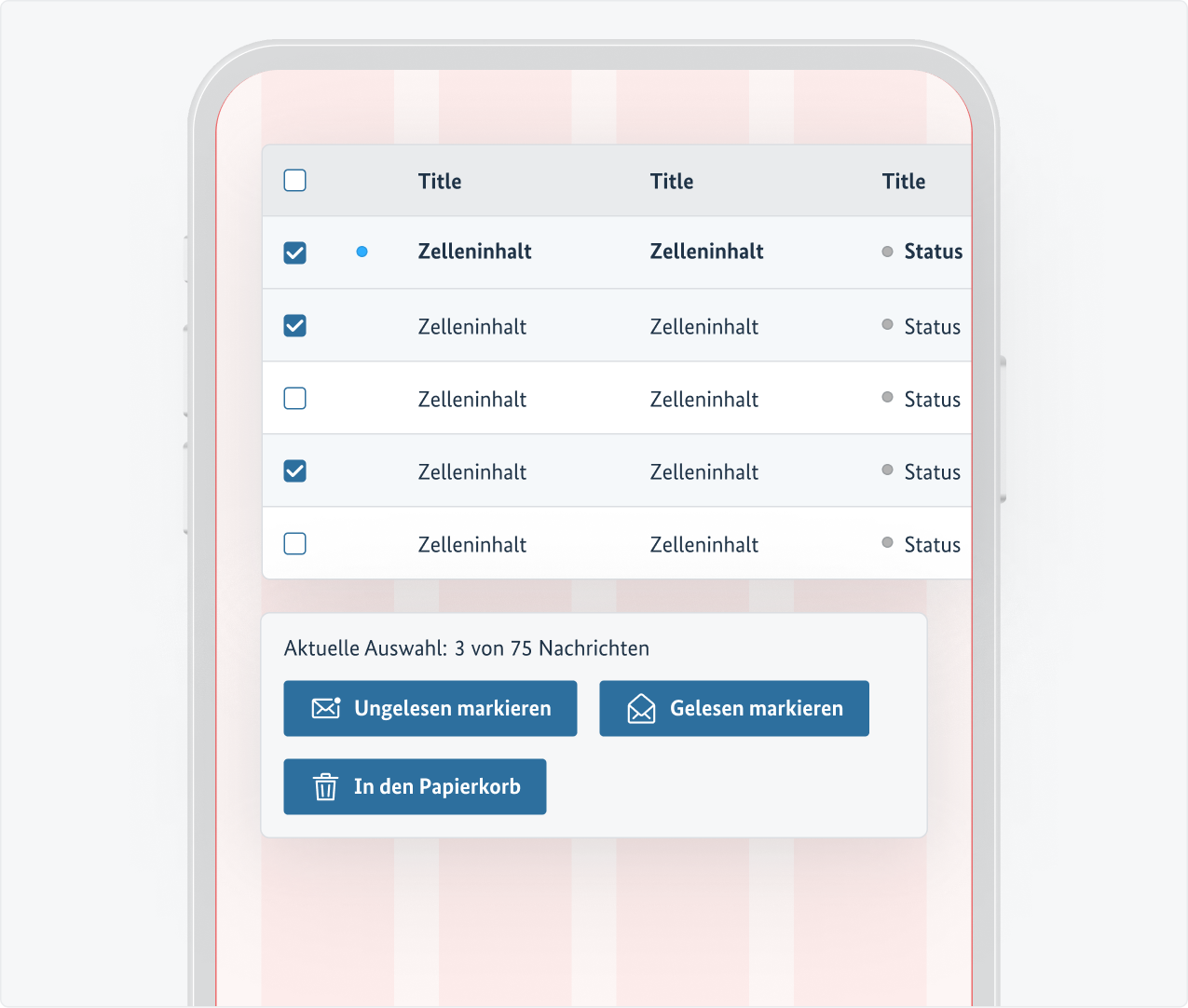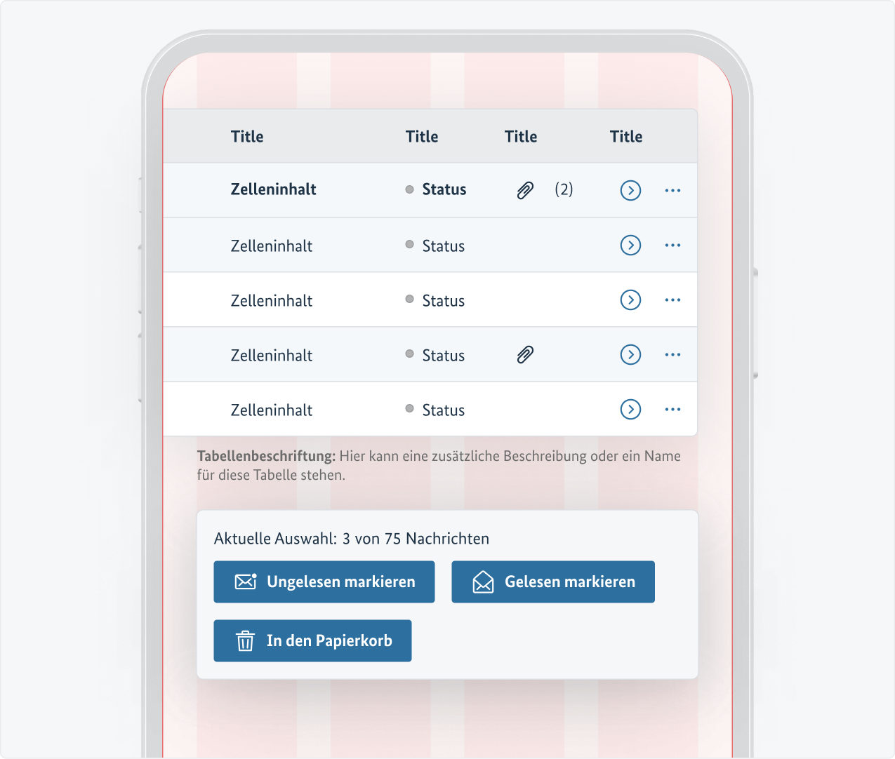 Ob eine Tabelle weiterhin angezeigt wird, wenn Nutzende den letzten verbliebenen Eintrag löschen, ist eine fachliche Einzelentscheidung. Entweder bleibt die Tabelle bestehen, wird aber mit mindestens einer Reihe von leeren Datenzellen angezeigt, oder die Tabelle inklusive der Kopfzeilen wird vollständig entfernt und durch einen Text wie z. B. „In Ihrem Postfach befinden sich keine Nachrichten“ ersetzt.