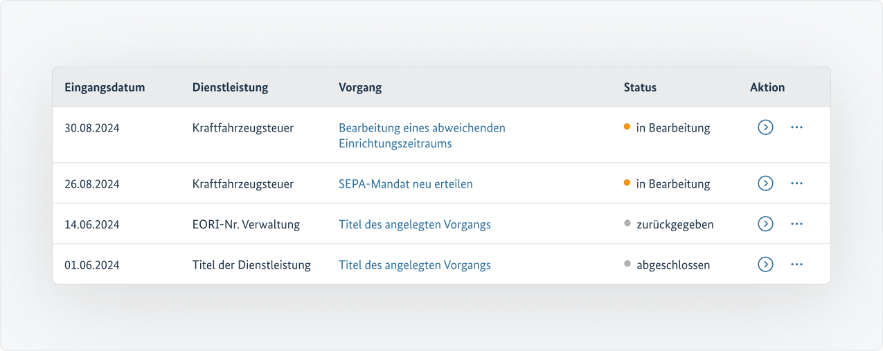 Die Anzahl der Spalten wird in erster Linie in der zugehörigen Maskenspezifikation definiert. Hierbei ist es zulässig, eine höhere Anzahl an Spalten zu definieren als in einer mobilen Ansicht vom Gerät dargestellt werden können. In diesem Fall sieht das Design System sogenannte Overflow-Tables vor, die in solchen Fällen einen horizontalen Scrollbalken ermöglichen. Bitte beachten Sie, dass hierfür ein weiterer Container mit tabindex="0" benötigt wird, um die Tabelle fokussierbar zu machen und damit die Tastaturbedienung der Inhalte einer solchen Tabelle zu ermöglichen.