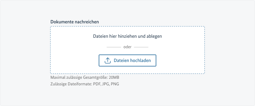 Die Upload-Komponente bietet die Möglichkeit, vorab definierte Dateiformate in das System hochzuladen. Sie besteht aus einem visuell klar gekennzeichneten und bei Interaktion hervorgehobenen Bereich, in dem Dokumente abgelegt werden können. Zusätzlich muss zwingend ein Tastatur-bedienbares Formularelement vom Typ input type="file" angeboten werden.