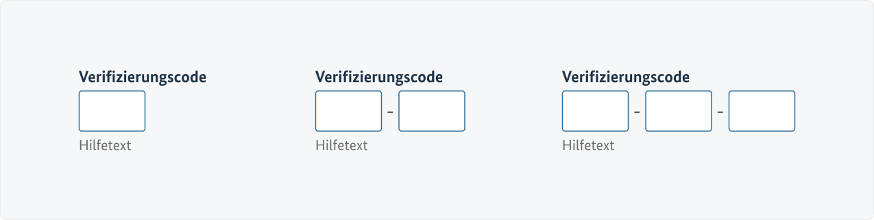 <divclass="ds-verification-code"data-desy-verificationcode> <fieldsetclass="verification-code__wrapper ds-form-check-group"data-desy-verificationcode-fieldsetdata-desy-verificationcode-validation="true"aria-describedby="code-verification-3-info"> <legendclass="ds-form-check-group__legend">Verifizierungscode</legend> <divclass="d-inline-flex align-items-center"> <labelfor="code-verification-3-1"class="form-label visually-hidden">1 von 3</label> <inputtype="text"name="code-verification-3-1"class="form-control verification-code__input"id="code-verification-3-1"data-desy-verificationcode-inputminlength="4"maxlength="4"pattern="^[a-zA-Z0-9]*$"requiredsize="4"placeholder="0000"> <span>-</span> <labelfor="code-verification-3-2"class="form-label visually-hidden">2 von 3</label> <inputtype="text"name="code-verification-3-2"class="form-control verification-code__input"id="code-verification-3-2"data-desy-verificationcode-inputminlength="4"maxlength="4"pattern="^[a-zA-Z0-9]*$"requiredsize="4"placeholder="0000"> <span>-</span> <labelfor="code-verification-3-3"class="form-label visually-hidden">3 von 3</label> <inputtype="text"name="code-verification-3-3"class="form-control verification-code__input"id="code-verification-3-3"data-desy-verificationcode-inputminlength="4"maxlength="4"pattern="^[a-zA-Z0-9]*$"requiredsize="4"placeholder="0000"> </div> </fieldset> <inputtype="hidden"name="code-verification-3"id="code-verification-3"data-desy-verificationcode-input-hidden> <divclass="invalid-feedback"id="code-verification-3-error"data-desy-verificationcode-error-messagerole="alert"> <spanclass="ds-icon-error-circle-filled"aria-hidden="true"></span> <span>Dieser Code ist ungültig. Bitte geben sie den Code vierstellig im alphanumerischen Format ein (z.B. Ab12)</span> </div> <divclass="form-text"id="code-verification-3-info">Hilfetext</div> </div>