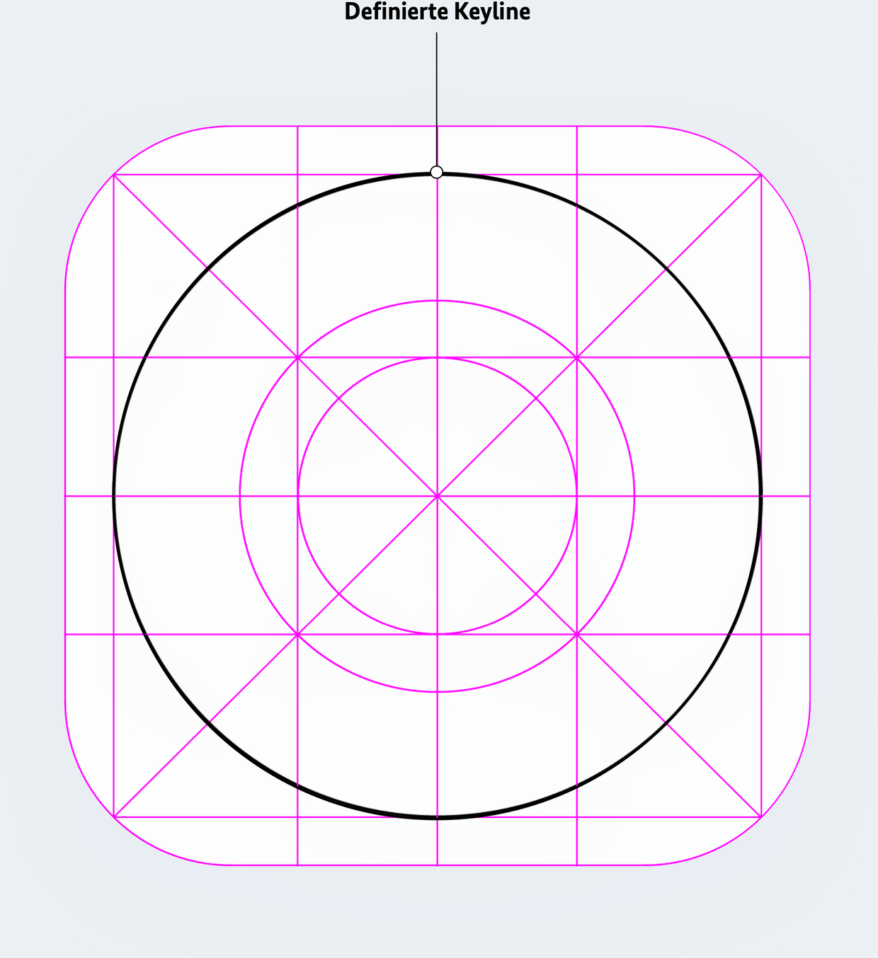 Das Basisgrid des Icons orientiert sich am iOS-Grid. Dabei dienen Bounding Boxes sowie Keylines lediglich der Orientierung. Das Icon wird innerhalb der definierten Keylines mittig zentriert platziert. Diese Methode gewährleistet Flexibilität bei der Umsetzung zukünftiger Icons.