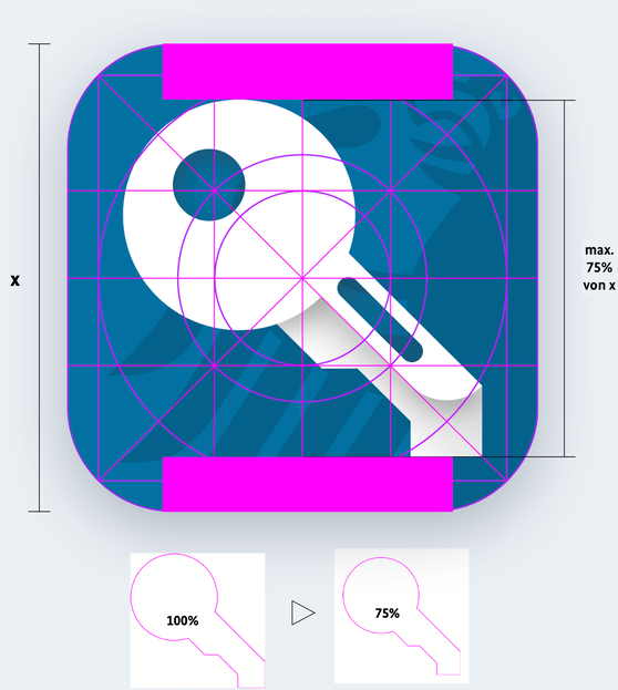 Um eine einheitliche Skalierung auf allen Anwendungsgrößen zu gewährleisten, folgt die Platzierung des Icons einer klaren Formel.