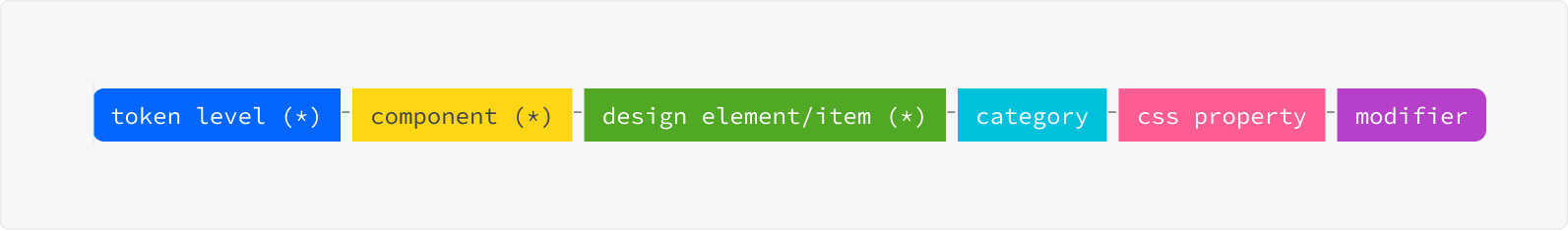 Jeder Component-Token besteht aus mehreren Token-Items, die zusammen den Einsatz des Tokens beschreiben. Getrennt werden diese Token-Items immer mit einem “-”.