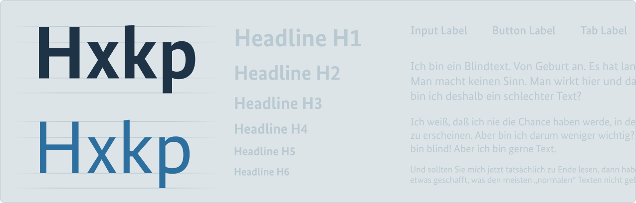 Abweichende Schriftart in Komponenten über alle Breakpoints; für Schriftgrad, Schriftschnitt und Zeilenhöhe siehe oben bei Überschriften Allgemein.